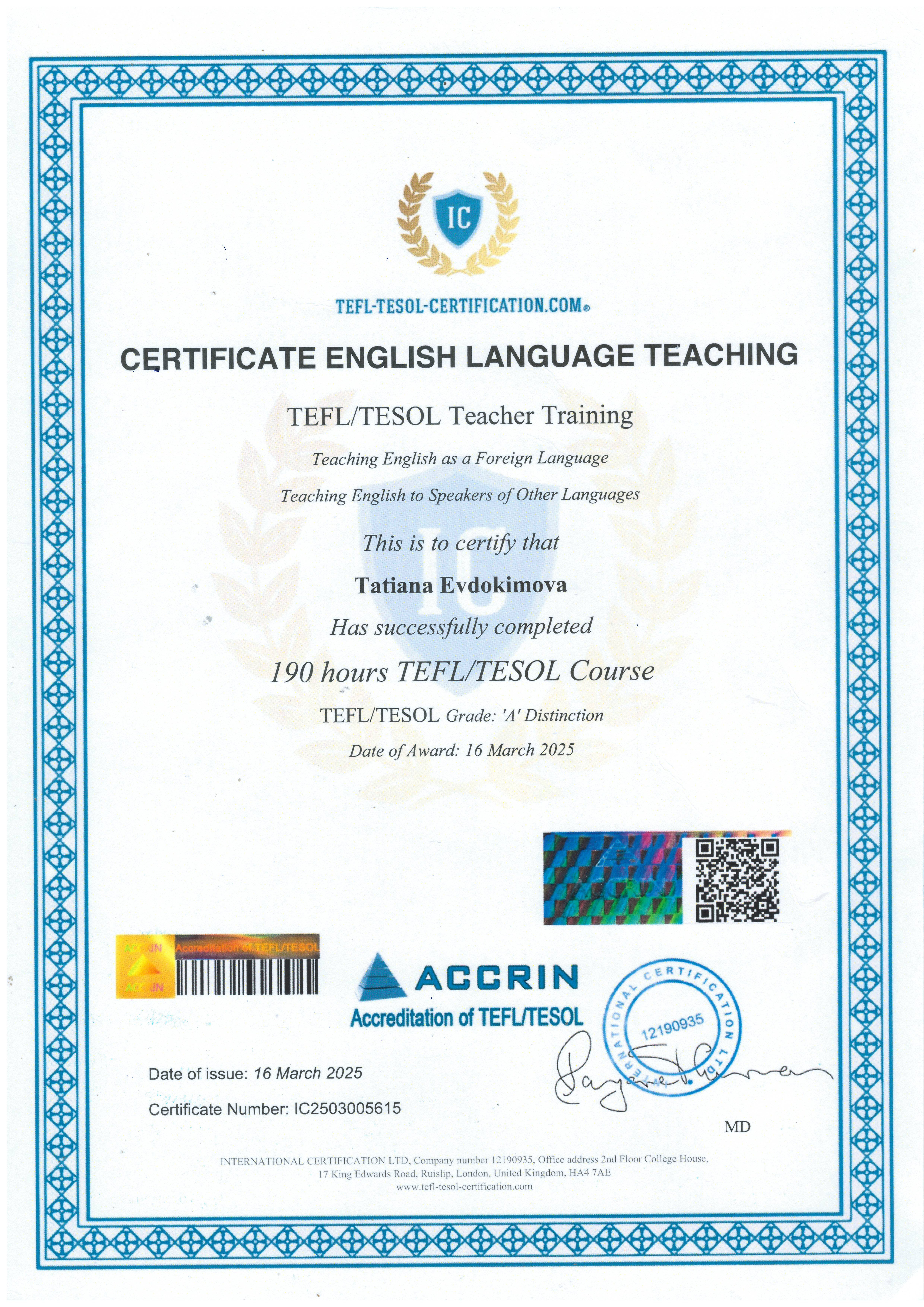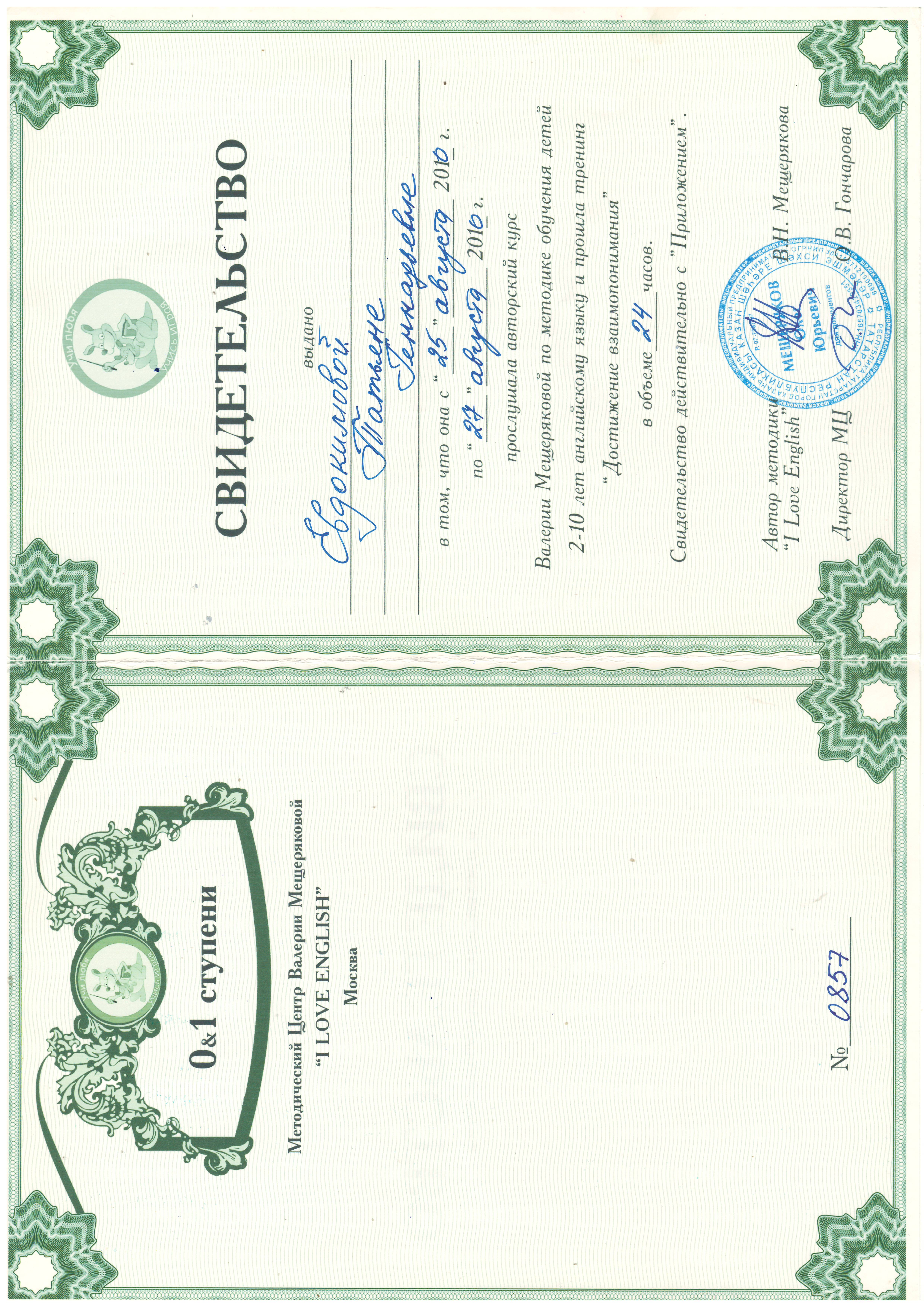 Повышение квалификации: Авторский курс по методике преподавания английского языка психолингвиста Дениса Рунова, Санкт-Петербург (2001), Авторский курс Валерии Мещеряковой по методике обучения детей 2-10 лет английскому языку, Москва (2010), международный сертификат преподавателя Certificate English Language Teaching TEFL\TESOL, Великобритания (2025).